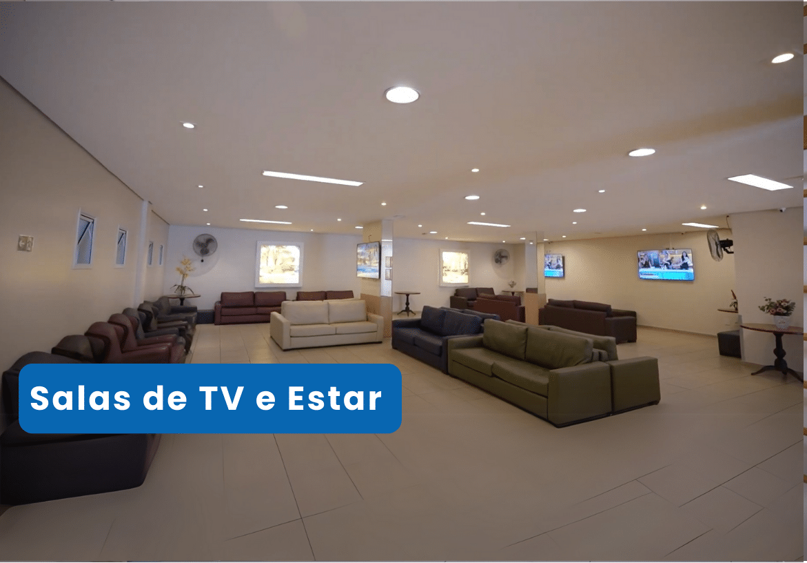 Nossas Salas de Estar e de TV são amplas e arejadas, equipadas com aparelhos de Televisão, sofás e poltronas confortáveis. Com mesas e espaços para jogos, eventos de música e terapia ocupacional.