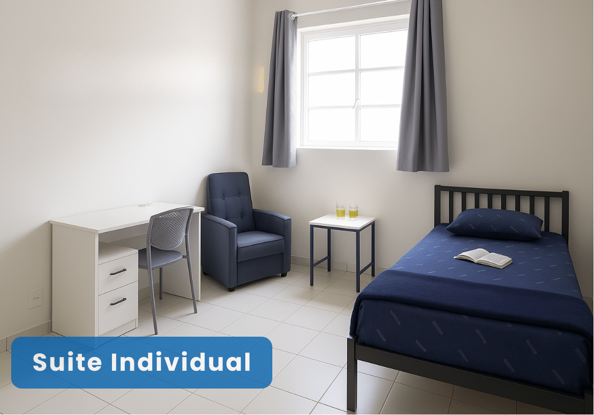 Possuímos suítes Individuais com mobiliário apropriado para o conforto e segurança dos hóspedes. Ideal para quem quer mais privacidade.