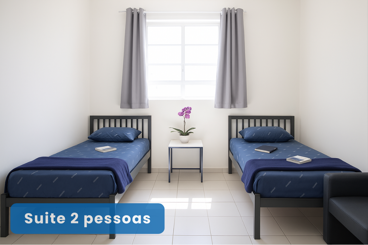 Nossas suítes duplas, proporcionam conforto e aconchego. O banheiro é equipado e preparado para idosos. Todos os quartos possuem ponto de TV a cabo.