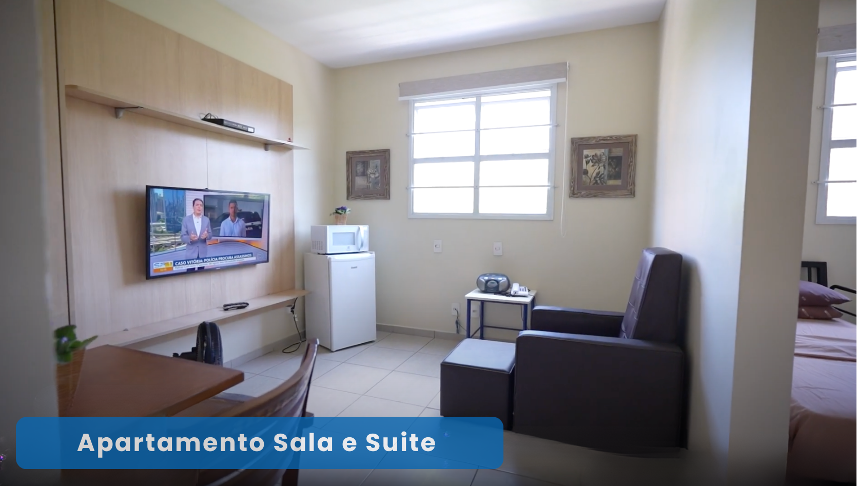 Nas unidades Apartamento, temos sala com frigobar, ponto de tv a cabo, mesa de refeição e um amplo quarto com poltrona e armário.