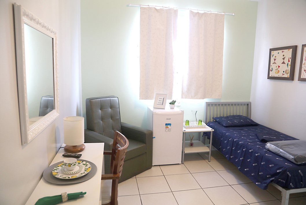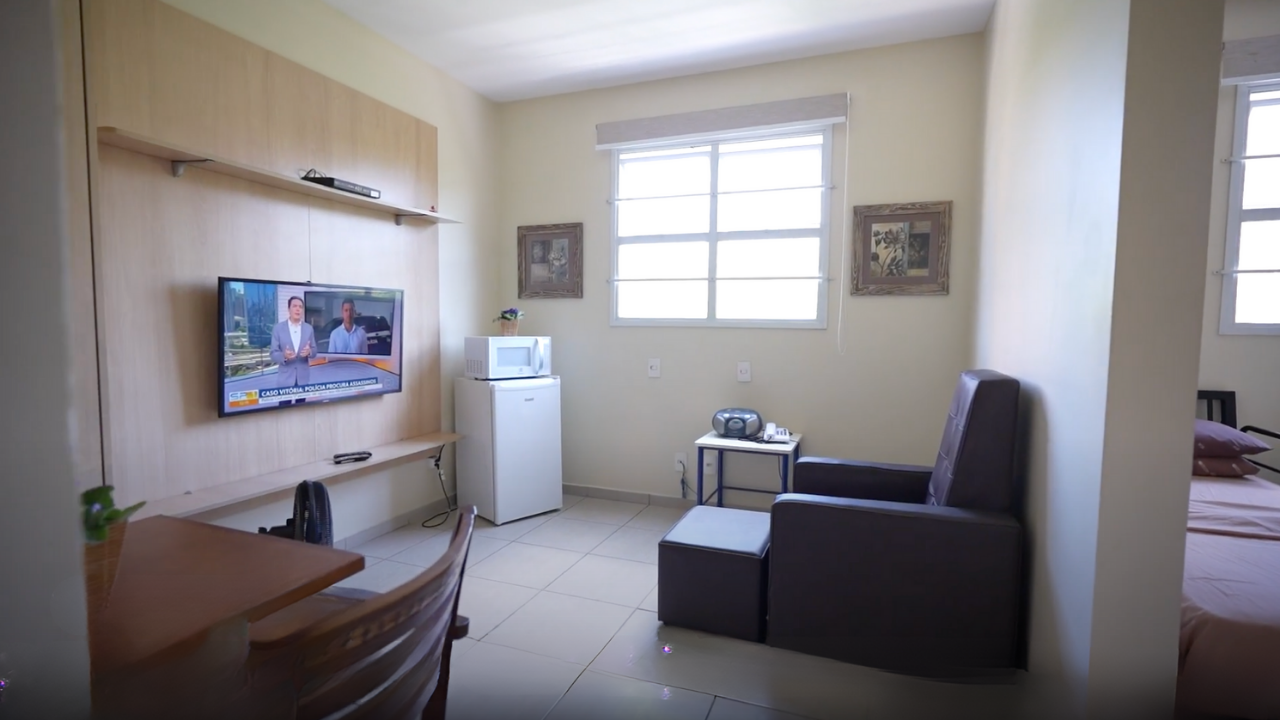Nas unidades Apartamento, temos sala com frigobar, ponto de tv a cabo, mesa de refeição e um amplo quarto com poltrona e armário.