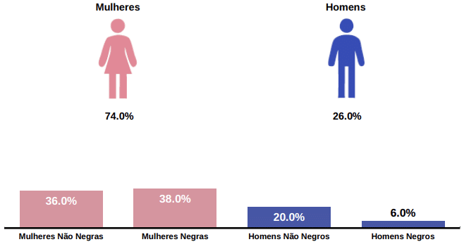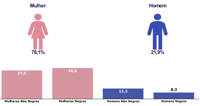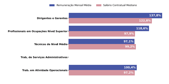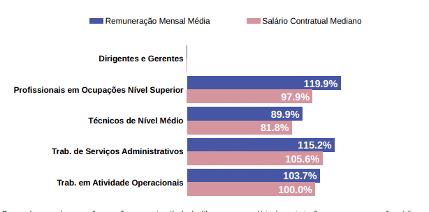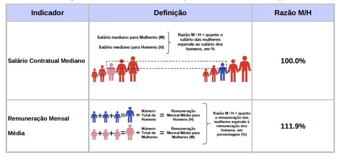 Diferença salarial entre mulheres e homens O salário contratual mediano das mulheres equivale a 100.0% do recebido pelos homens. A remuneração média mensal das mulheres equivale a 111.9% da recebida pelos homens.